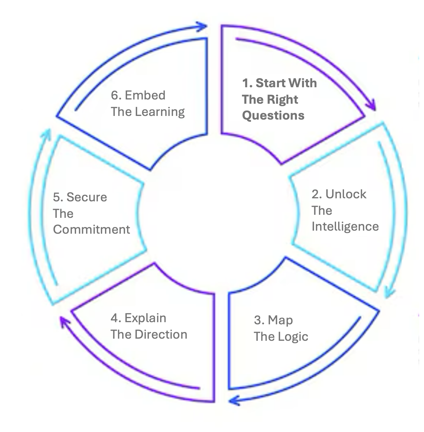 Question first, answers later Every challenge starts by defining the right questions. Most teams skip this entirely — arriving with a preferred answer already forming and spending their time debating it. This single shift changes everything downstream.